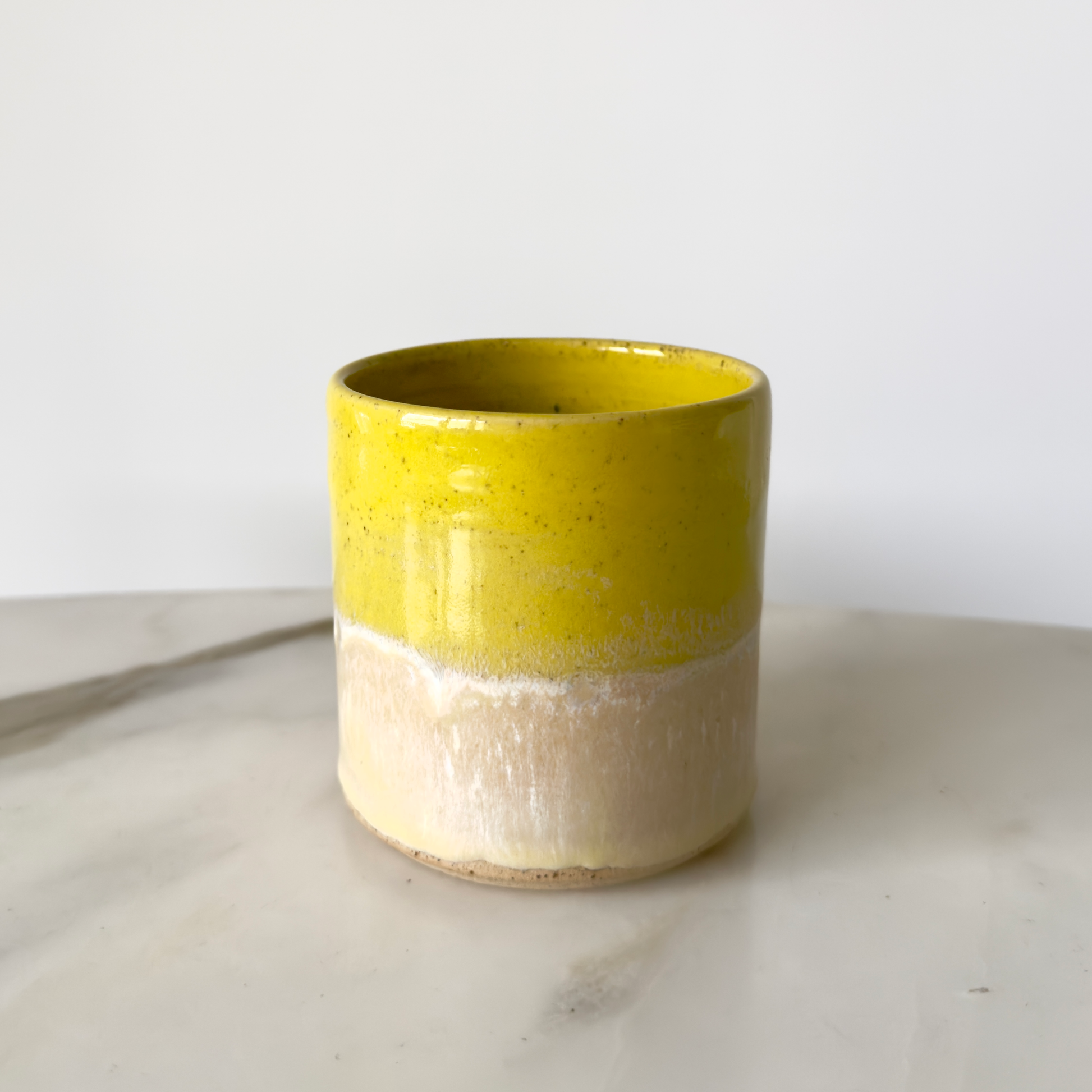 Découvrez l'harmonie céleste dans chaque tasse avec notre mug en céramique fait main couleur jaune soleil et blanc perle, une pièce unique design demi-lune. Élevez vos pauses café.