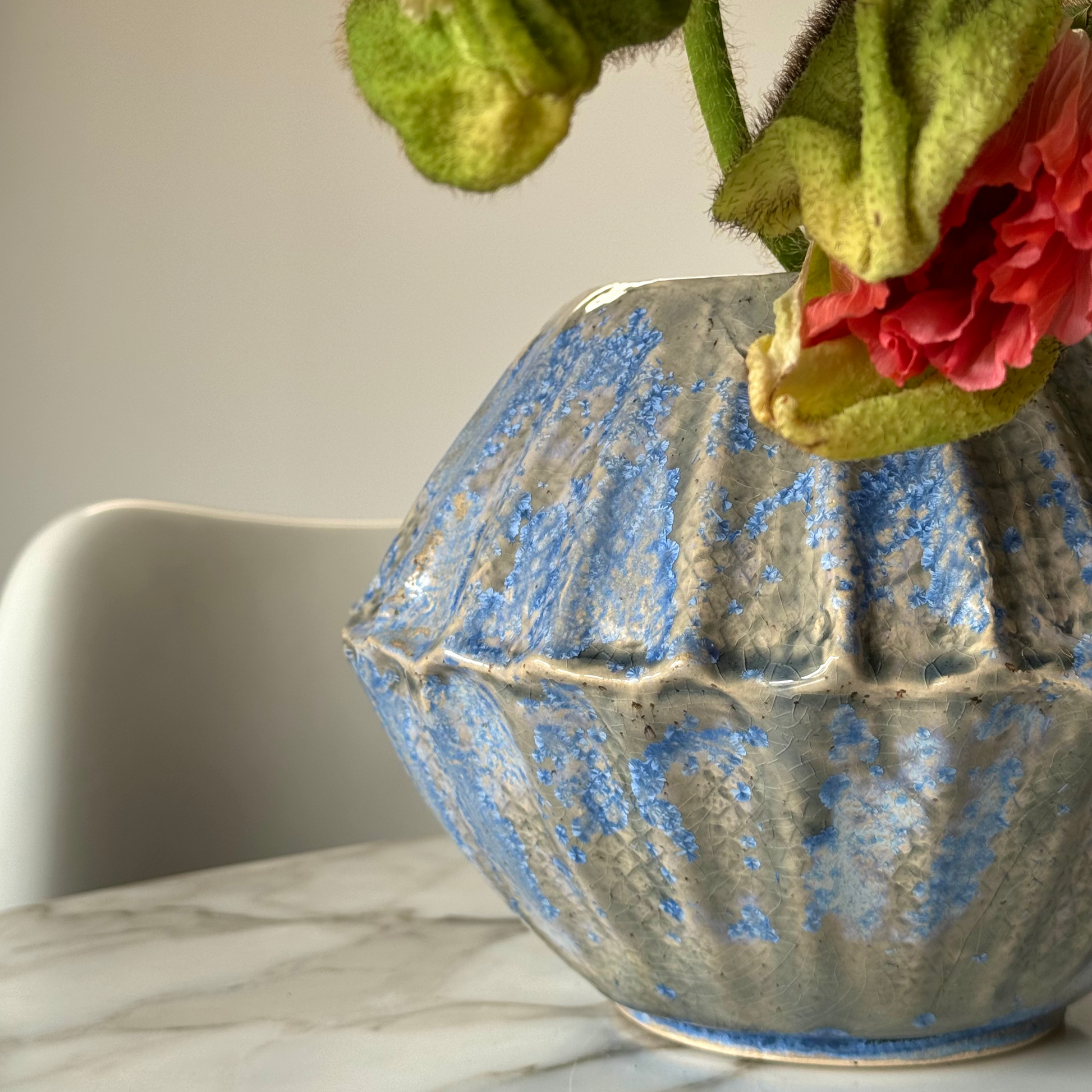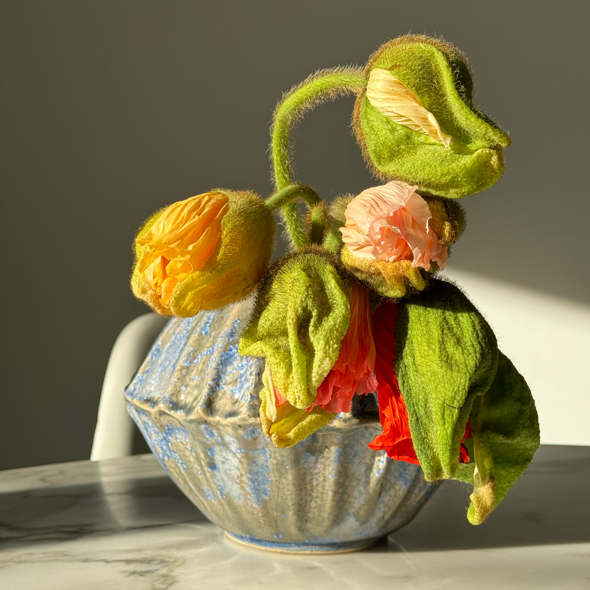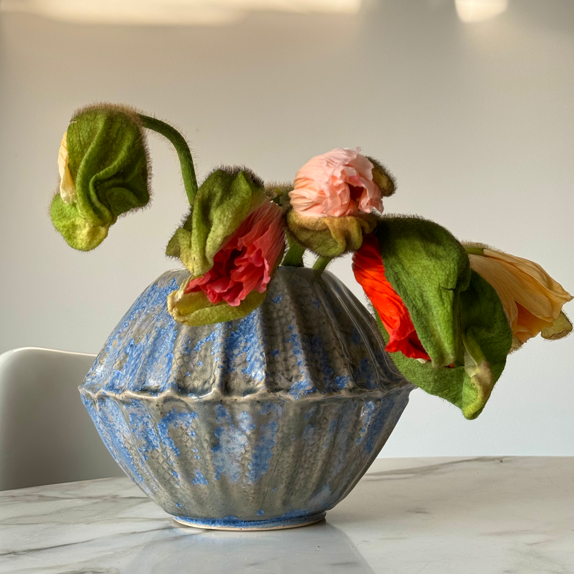 Un vase bleu en grés au style romantique 19e siècle, orné de pavots, trône avec élégance au centre du salon. Ses courbes délicates captent la lumière tamisée, tandis que les couleurs vives des fleurs égayent l'espace. Une touche de charme vintage se mêle à la modernité de la pièce, créant ainsi une ambiance chaleureuse et accueillante.