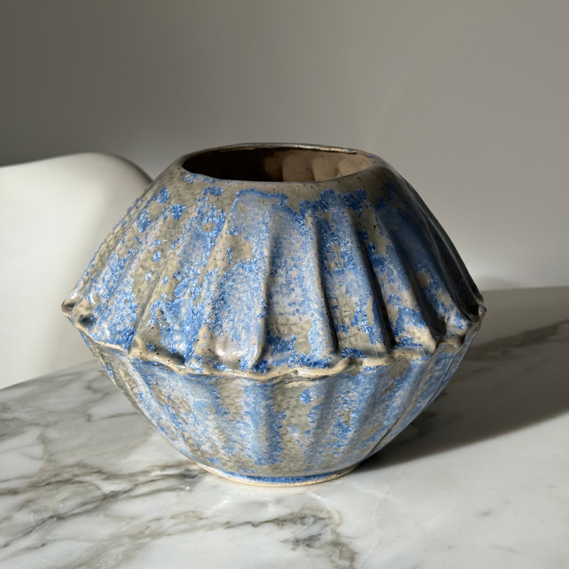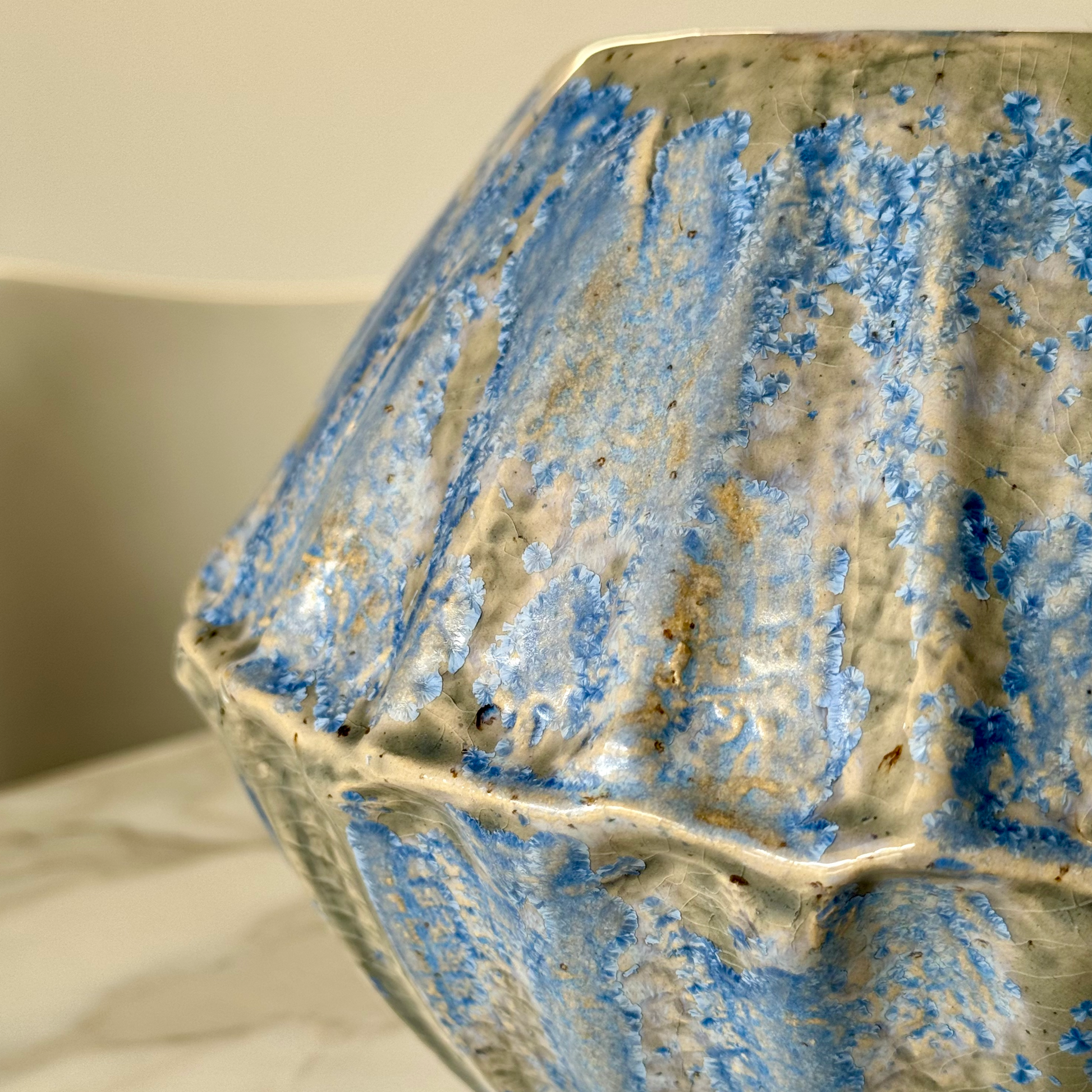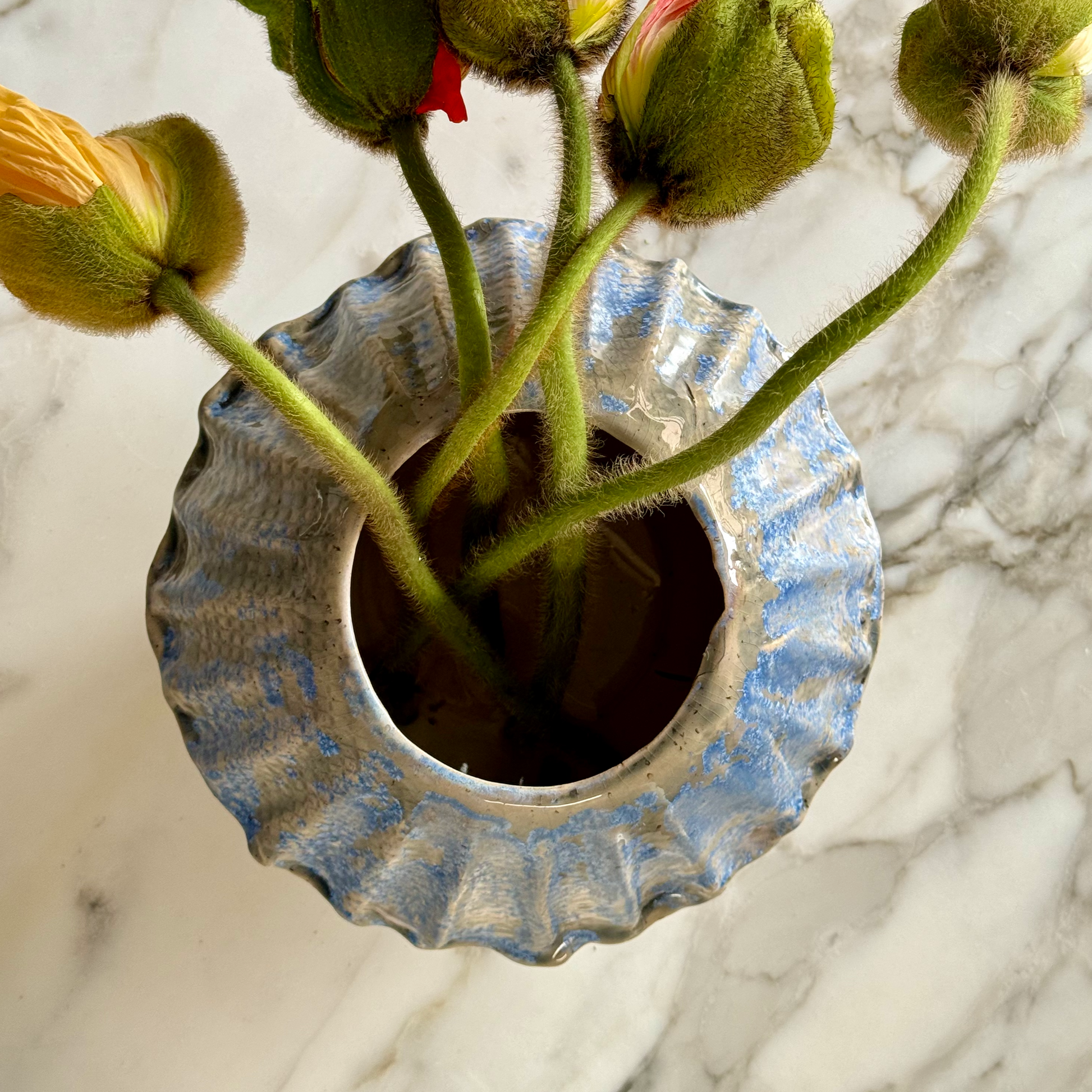Un vase bleu en grés au style romantique 19e siècle, orné de pavots, trône avec élégance au centre du salon. Ses courbes délicates captent la lumière tamisée, tandis que les couleurs vives des fleurs égayent l'espace. Une touche de charme vintage se mêle à la modernité de la pièce, créant ainsi une ambiance chaleureuse et accueillante.